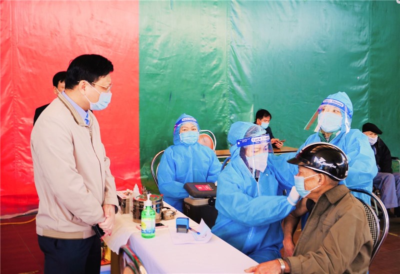 Đồng chí Nghiêm Xuân Cường, Tỉnh Ủy Viên, Bí thư Thành ủy, Chủ tịch HĐND thành phố kiểm tra công tác tiêm chủng tại điểm tiêm Nhà hát thành phố.