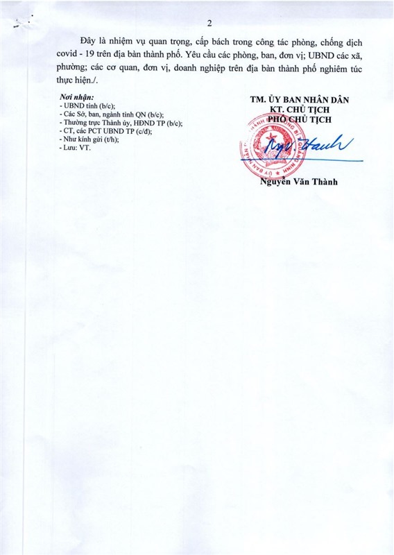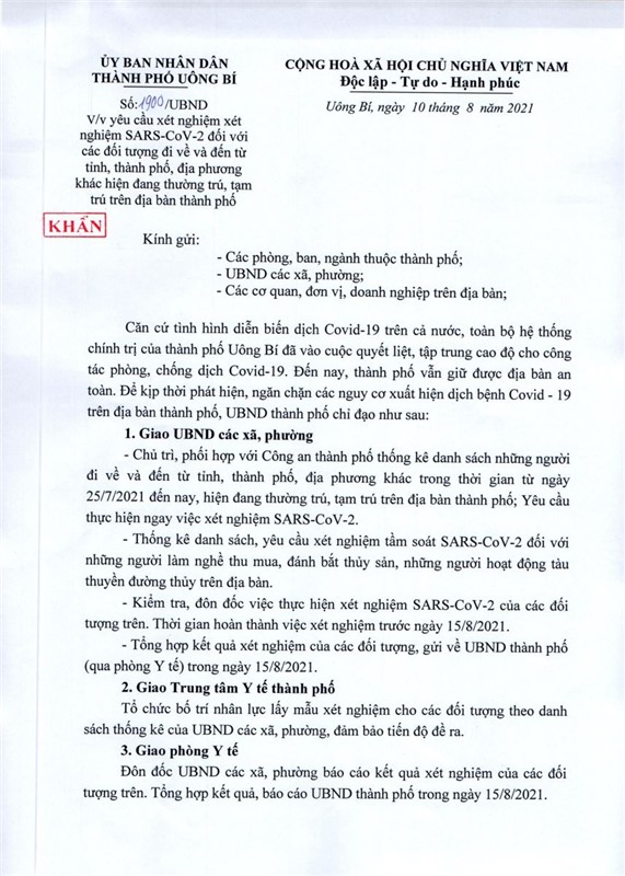 Ngày 10-8, Ủy ban nhân dân thành phố Uông Bí ban hành văn bản số 1900/UBND về việc yêu cầu xét nghiệm SARS-CoV-2 đối với các đối tượng đi về và đến từ tỉnh, thành phố, địa phương khác hiện đang thường trú, tạm trú trên địa bàn thành phố.