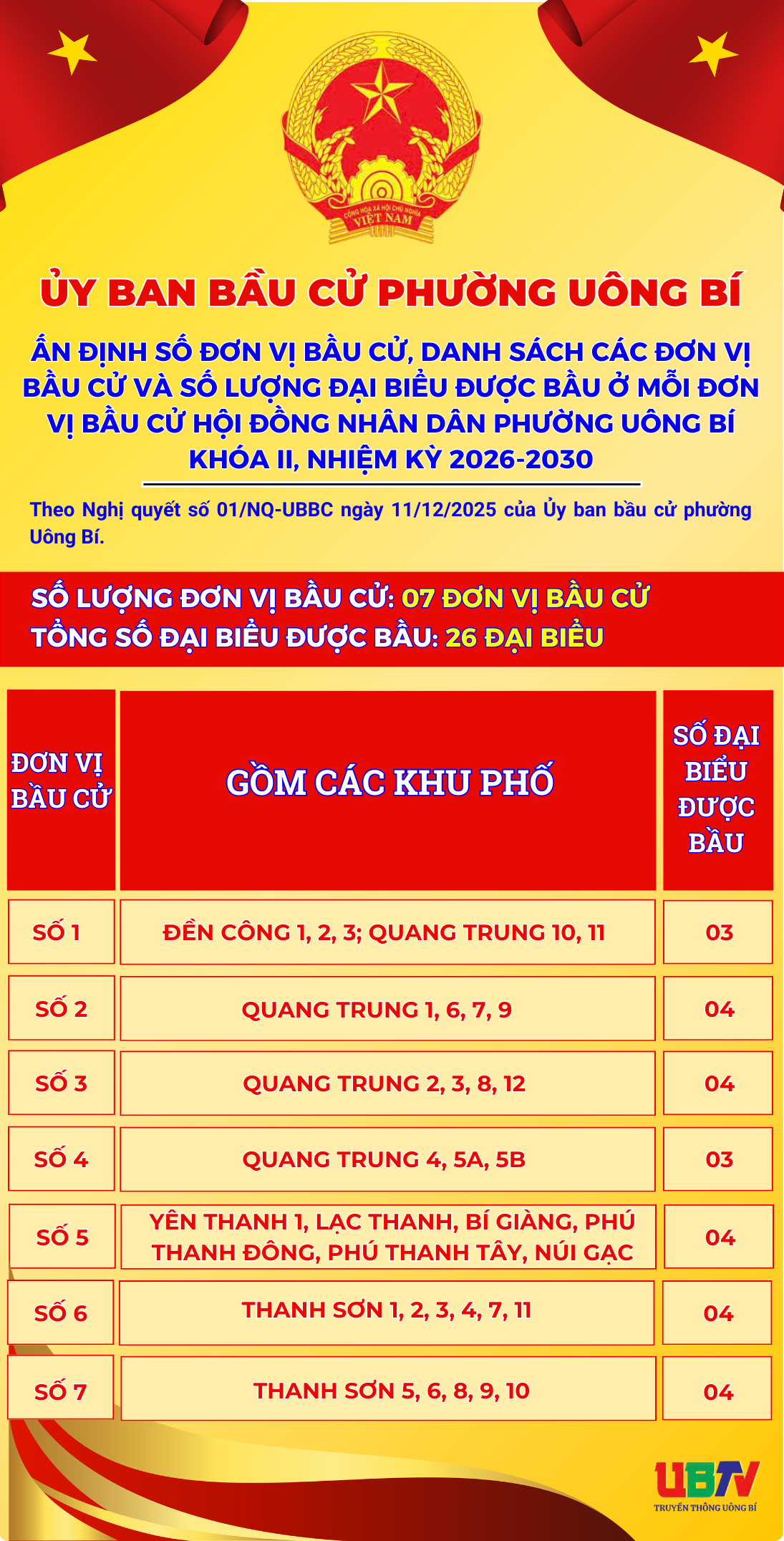 ỦY BAN BẦU CỬ PHƯỜNG UÔNG BÍ: ẤN ĐỊNH SỐ ĐƠN VỊ BẦU CỬ, DANH SÁCH CÁC ĐƠN VỊ BẦU CỬ VÀ SỐ LƯỢNG ĐẠI BIỂU ĐƯỢC BẦU Ở MỖI ĐƠN VỊ BẦU CỬ HĐND PHƯỜNG UÔNG BÍ KHÓA II, NHIỆM KỲ 2026-2030