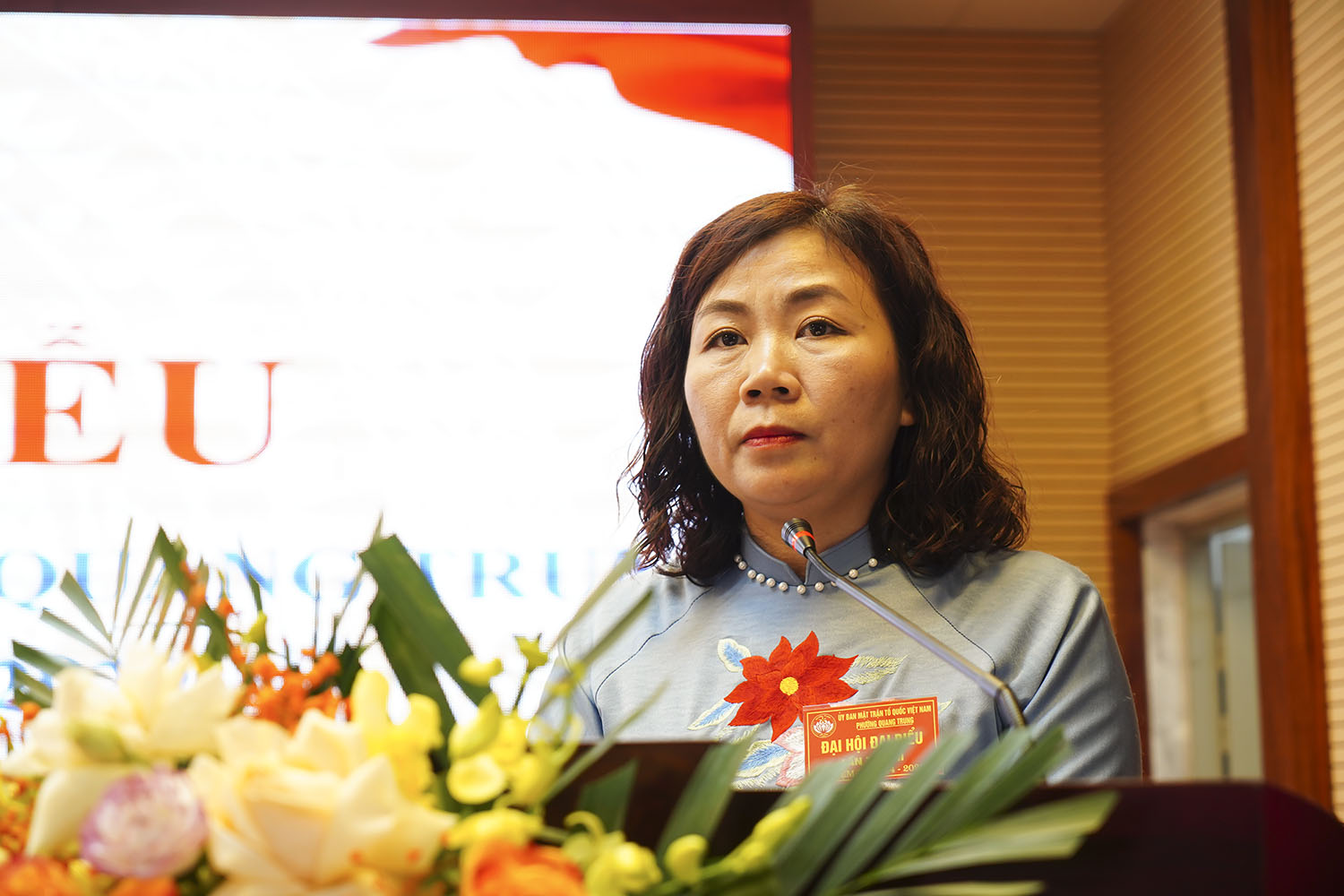 Đồng chí Nguyễn Thị Lương, Chủ tịch Ủy ban MTTQ phường Quang Trung khóa XI báo cáo kết quả công tác nhiệm kỳ 2019-2024.