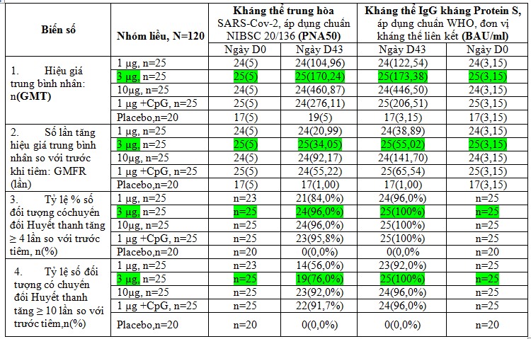 Cụ thể, về tính đáp ứng miễn dịch, các chuyên gia đánh giá, tất cả 4 nhóm mức liều khác nhau của vaccine COVIVAC đều có đáp ứng miễn dịch, trong đó nhóm liều cao nhất là 10mcg, tiếp đến là nhóm 1mcg + tá chất, nhóm 3mcg và đến nhóm 1mcg.