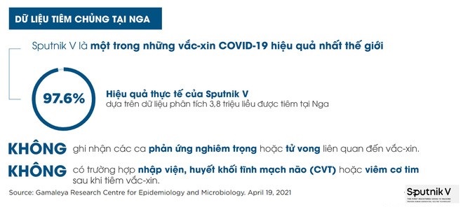 Theo dữ liệu được Trung tâm Nghiên cứu Dịch tễ học và Vi sinh vật học Gamaleya tuyên bố, tính đến ngày 19/4/2021, đã có 3,8 triệu liều vaccine Sputnik V được tiêm tại Nga. Dữ liệu trong giai đoạn này cho thấy vaccine Sputnik V có khả năng phòng ngừa COVID-19 lên tới 97,6% và cung cấp sự bảo vệ 100% chống lại các trường hợp có triệu chứng nghiêm trọng.