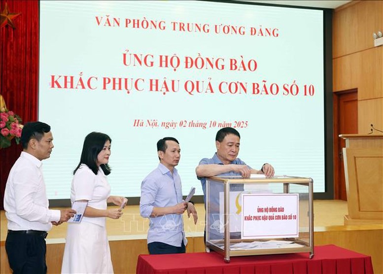 Với truyền thống tốt đẹp của dân tộc Việt Nam “tương thân, tương ái”, “thương người như thể thương thân”, chiều tối 2/10, tại Hà Nội, Văn phòng Trung ương Đảng tổ chức quyên góp ủng hộ đồng bào các tỉnh, thành phố (Ninh Bình, Thanh Hóa, Nghệ An, Hà Tĩnh, Huế, Đà Nẵng, Quảng Ninh, Hải Phòng, Hưng Yên, Lào Cai, Sơn La, Phú Thọ, Tuyên Quang, Lạng Sơn, Cao Bằng, Thái Nguyên, Bắc Ninh) bị ảnh hưởng do bão số 10 gây ra, sớm vượt qua khó khăn, ổn định cuộc sống.
