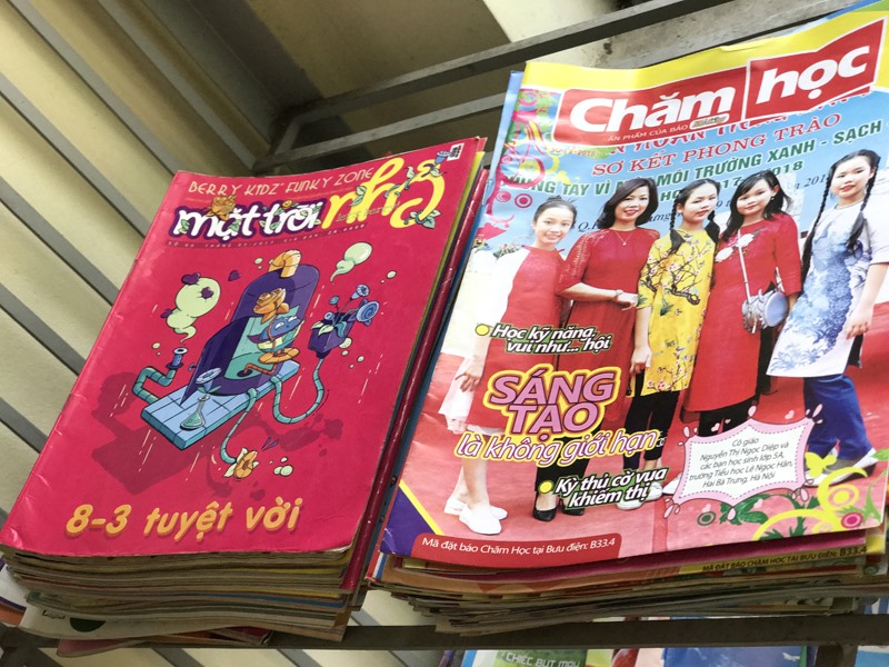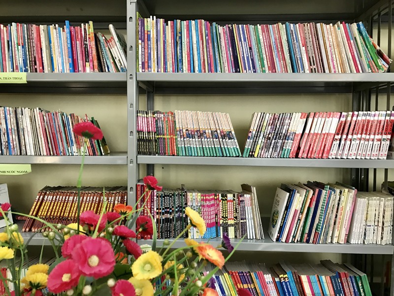 Tại thư viện có nhiều loại sách, báo thiếu nhi ưa thích.