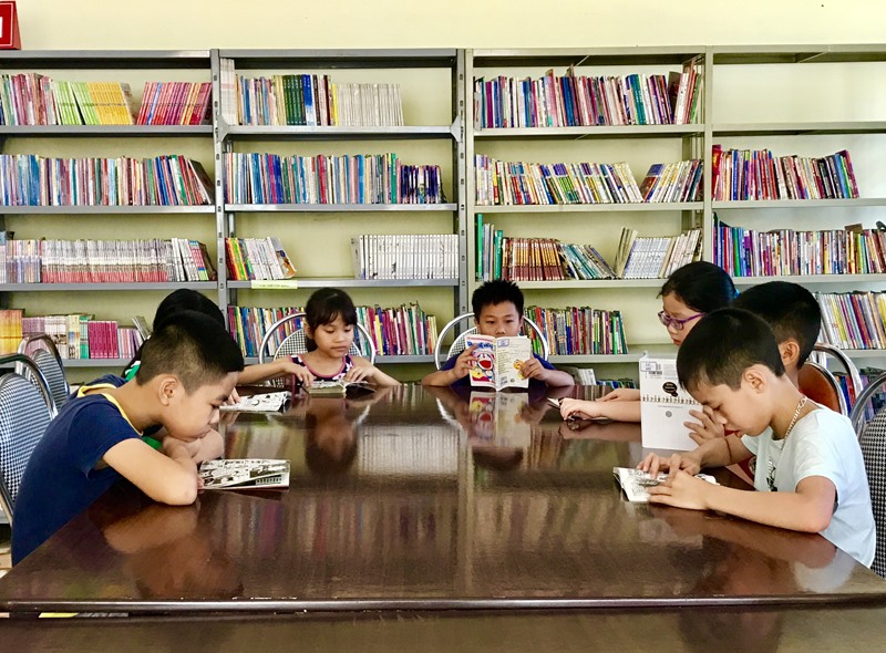 Các bạn nhỏ chăm chú đọc những quyển sách, truyện yêu thích.