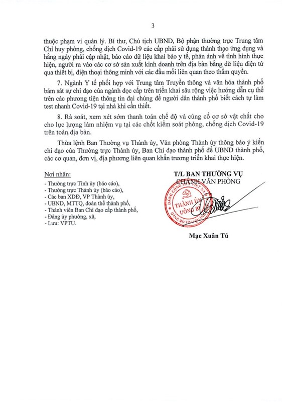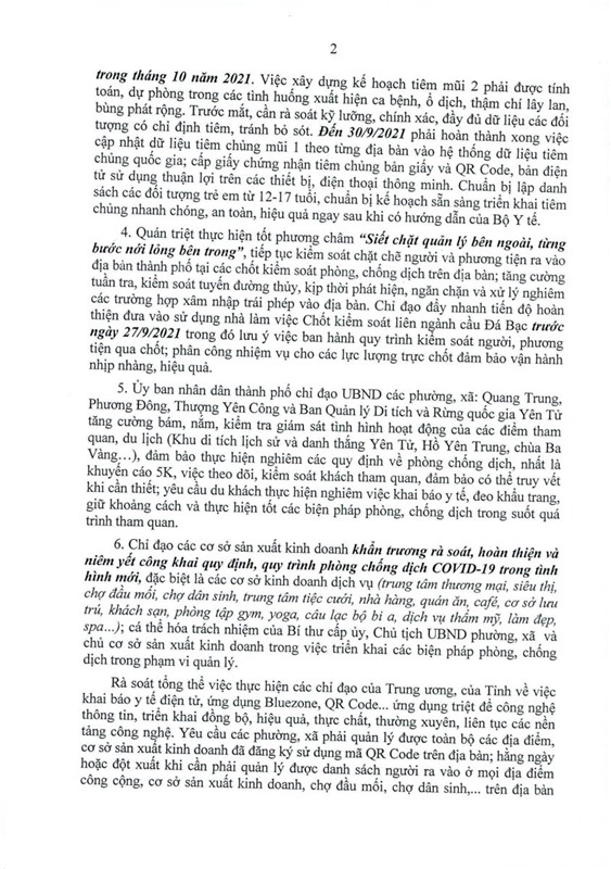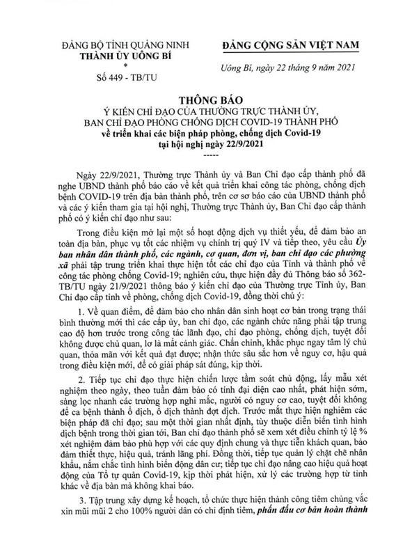 Ngày 22-9, Thường trực Thành ủy và Ban chỉ đạo cấp thành phố ban hành Thông báo số 449-TB/TU về triển khai các biện pháp phòng, chống dịch Covid-19 tại hội nghị ngày 22/9/2021.