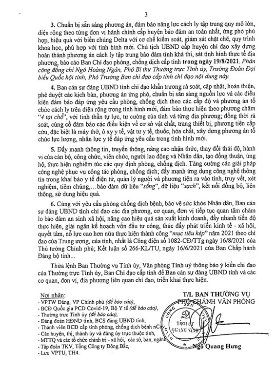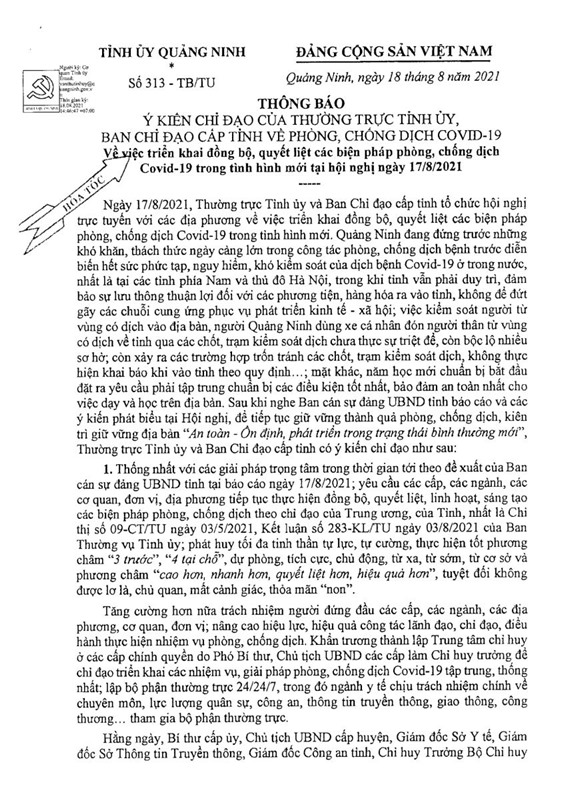Ngày 18-8, Thường trực Tỉnh ủy và Ban Chỉ đạo cấp tỉnh ban hành Thông báo số 313-TB/TU về việc triển khai đồng bộ, quyết liệt các biện pháp phòng, chống dịch Covid-19 trong tình hình mới tại hội nghị ngày 17/8/2021
