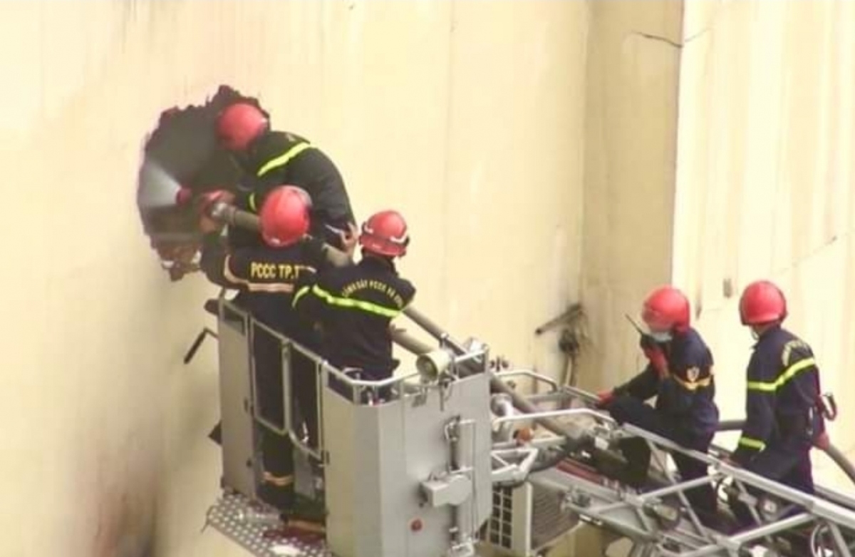Lực lượng PCCC đục tường để vào bên trong tìm kiếm nạn nhân bị mắc kẹt.
