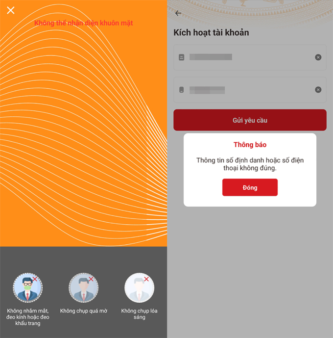 Tuy nhiên khi quét mã QR Code từ Căn cước công dân gắn chip, hệ thống liên tục báo lỗi. Anh đành tự nhập các thông tin cá nhân trên căn cước vào ứng dụng. Cuối cùng khi đến phần quét khuôn mặt, hệ thống cảnh báo "không nhắm mắt, đeo kính hoặc khẩu trang, không chụp quá mờ hoặc loá sáng".