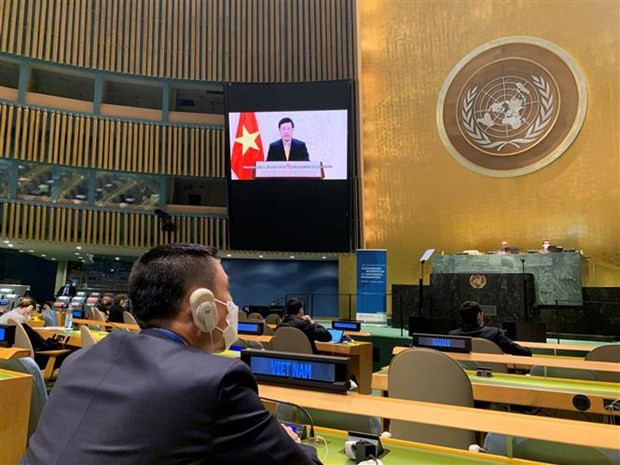 Bài phát biểu ghi hình của Phó Thủ tướng Phạm Bình Minh tại Cuộc họp cấp cao của Đại hội đồng Liên hợp quốc. (Ảnh: TTXVN)