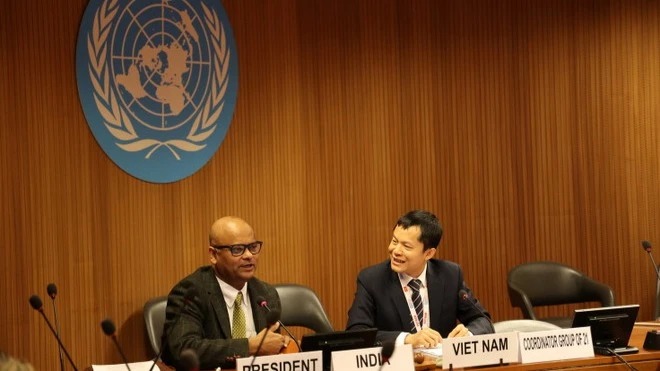 Chủ tịch luân phiên của Hội nghị Giải trừ Quân bị - ông Anupam Ray và Đại biện lâm thời của Phái đoàn Việt Nam tại Geneva - ông Cung Đức Hân. (Ảnh: Anh Hiển/TTXVN)