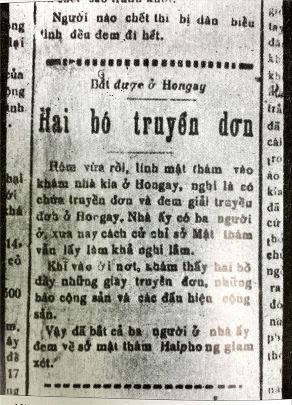 Tin đăng trên báo Đông Pháp, mật thám đã bắt được nhiều truyền đơn và báo chí cộng sản ở Hòn Gai năm 1930. Ảnh: Tin của báo Đông Pháp