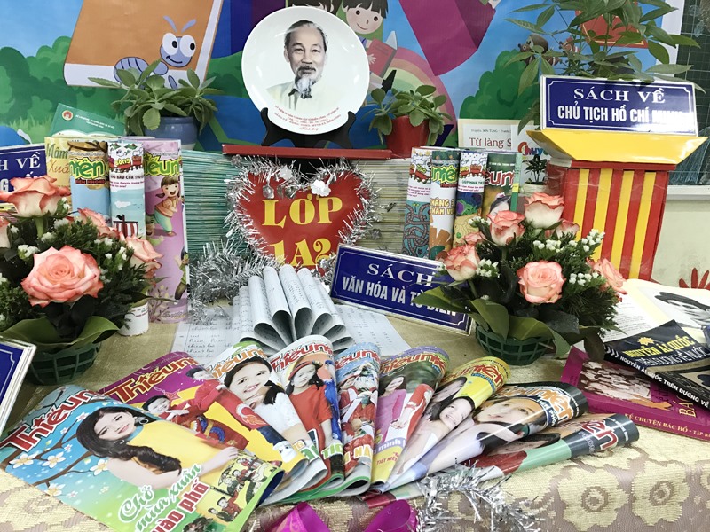 Với chủ đề: Đọc sách cho ngày mai, 60 đầu sách, cùng các cuốn truyện, báo nhi đồng đã được cô, trò, có sự hỗ trợ nhiệt tình của phụ huynh dụng công sắp xếp, trang trí thành một bàn trưng bày đẹp mắt. Trong đó, Tủ sách Bác Hồ được xếp mô phỏng theo hình Lăng Bác. Các loại sách tham khảo, sách giáo khoa, truyện tranh được xếp gọn gàng, đẹp mắt theo khu vực. Các giỏ, lọ hoa, bóng bay trang trí điểm xuyết tạo nên bức tranh về sách sinh động, gần gũi với tuổi thơ.