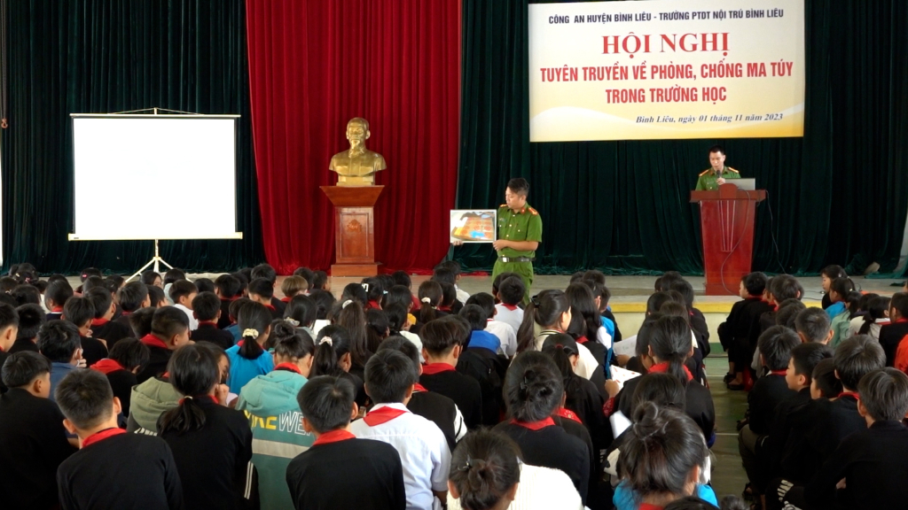 Tuyên truyền về phòng, chống mua túy trong trường học tại Trường PTDT nội trú huyện Bình Liêu. Ảnh: Lê Nam