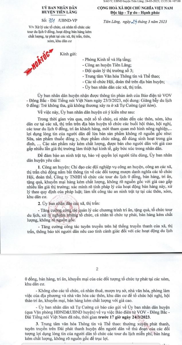 UBND huyện Tiên Lãng (Hải Phòng) yêu cầu xử lý các tổ chức, cá nhân tổ chức các tour du lịch 0 đồng, hoạt động bán hàng kém chất lượng, tự phát tại các xã, thị trấn, thôn, xóm, khu dân cư.