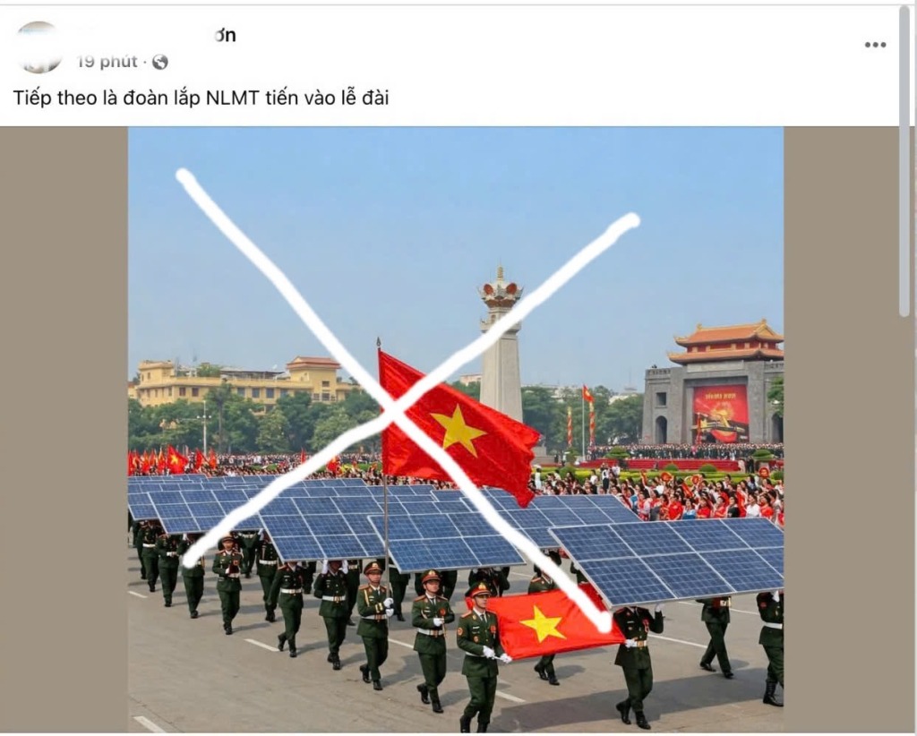 Cụ thể, ngày 30/4/2025, P.Q.S đã sử dụng tài khoản Facebook cá nhân đăng bài viết với tiêu đề “Tiếp theo là đoàn lắp NLMT tiến vào lễ đài” kèm hình ảnh chỉnh sửa bằng AI, thể hiện LLVT nhân dân đang bê các tấm pin năng lượng mặt trời trong lễ diễu binh. Nội dung này là hoàn toàn sai sự thật, gây ảnh hưởng nghiêm trọng đến uy tín, danh dự của LLVT nhân dân và làm ANTT.