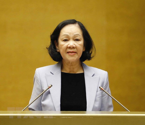 Bà Trương Thị Mai, Ủy viên Bộ Chính trị, Bí thư Trung ương Đảng, Trưởng Ban Tổ chức Trung ương trình bày báo cáo tại hội nghị. (Ảnh: Phương Hoa/TTXVN)