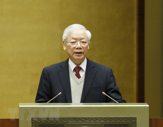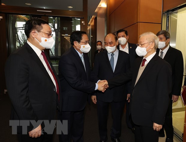 Tổng Bí thư Nguyễn Phú Trọng cùng các đồng chí lãnh đạo Đảng, Nhà nước dự hội nghị. (Ảnh: Trí Dũng/TTXVN)