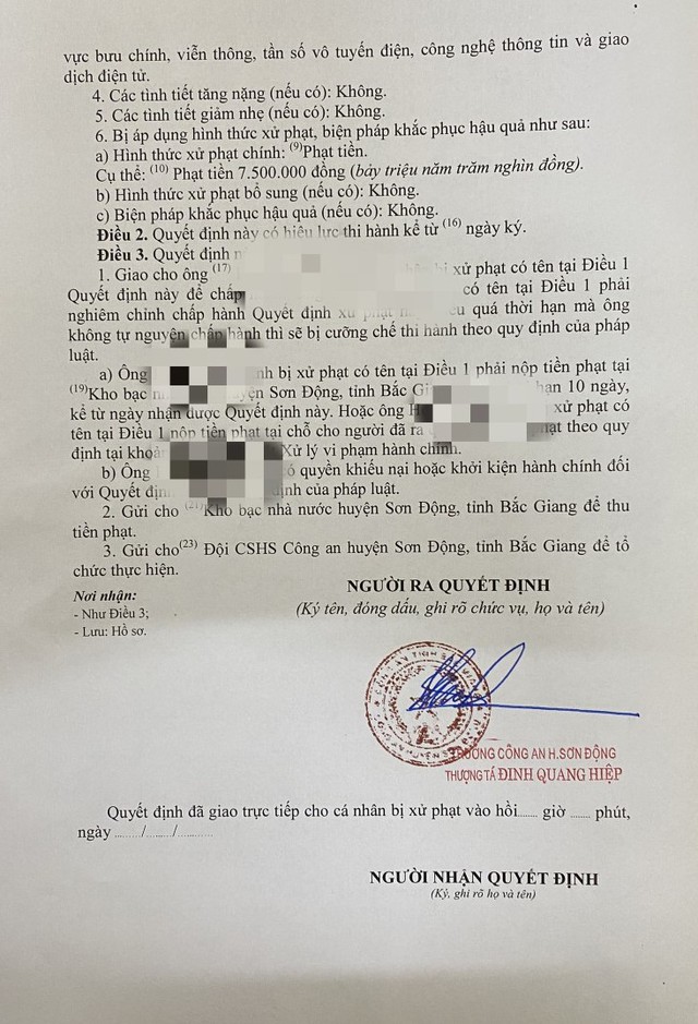 Liên quan đến vụ việc chuyển cuộc gọi đến đường dây nóng của Bộ Công an sai quy định, Trưởng Công an huyện Sơn Động (tỉnh Bắc Giang) vừa ban hành Quyết định xử phạt Hoàng Tuấn H (SN 1989; trú tại xã Thanh Luận, huyện Sơn Động) số tiền 7,5 triệu đồng về hành vi thu thập, sử dụng thông tin của tổ chức mà không được sự đồng ý theo quy định của pháp luật.