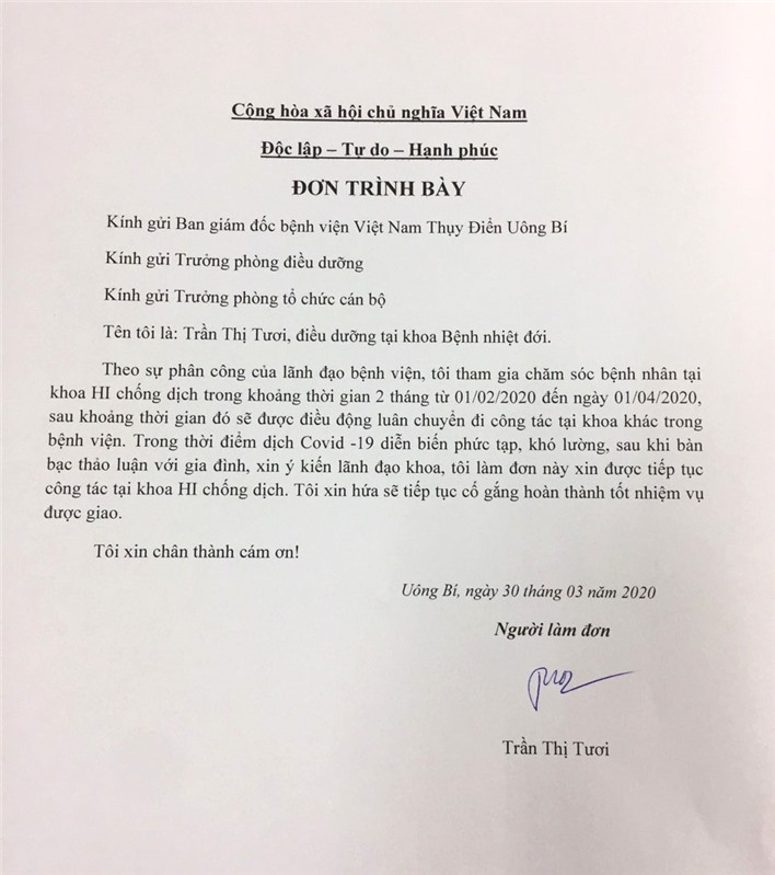 “Trong thời điểm dịch Covid-19 diễn biến phức tạp, khó lường, sau khi bàn bạc, thảo luận với gia đình, xin ý kiến lãnh đạo khoa, tôi làm đơn này xin được tiếp tục công tác tại khoa HI – khoa Bệnh nhiệt đới (PV) để chống dịch…”. Đó là nguyện vọng trích trong lá đơn tình nguyện xin được tiếp tục ở lại “tuyến đầu” chống dịch của điều dưỡng Trần Thị Tươi gửi BGĐ Bệnh viện Việt Nam - Thụy Điển Uông Bí.