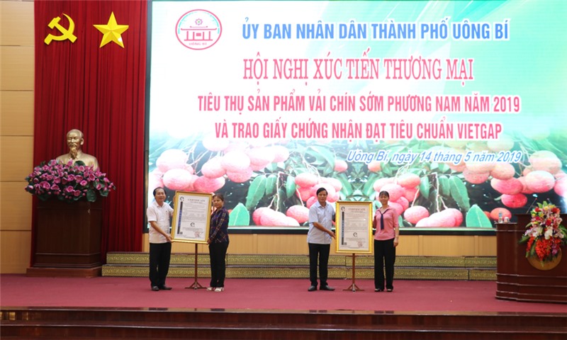 Nhân dịp này, lãnh đạo TP Uông Bí đã trao giấy chứng nhận sản phẩm quả vải đạt tiêu chuẩn VietGAP giai đoạn I cho HTX vải chín sớm Cẩm Hồng và HTX vải chín sớm Phong Thái.