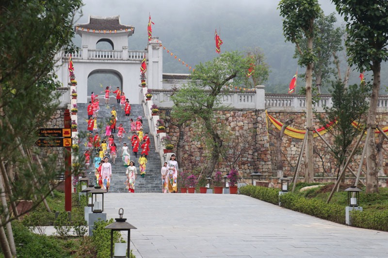 Phân đoạn trình diễn các mẫu áo dài của NTK-Hoa hậu Ngọc Hân tại khu vực cổng Khai tâm-TT Văn hóa Trúc Lâm Yên Tử.
