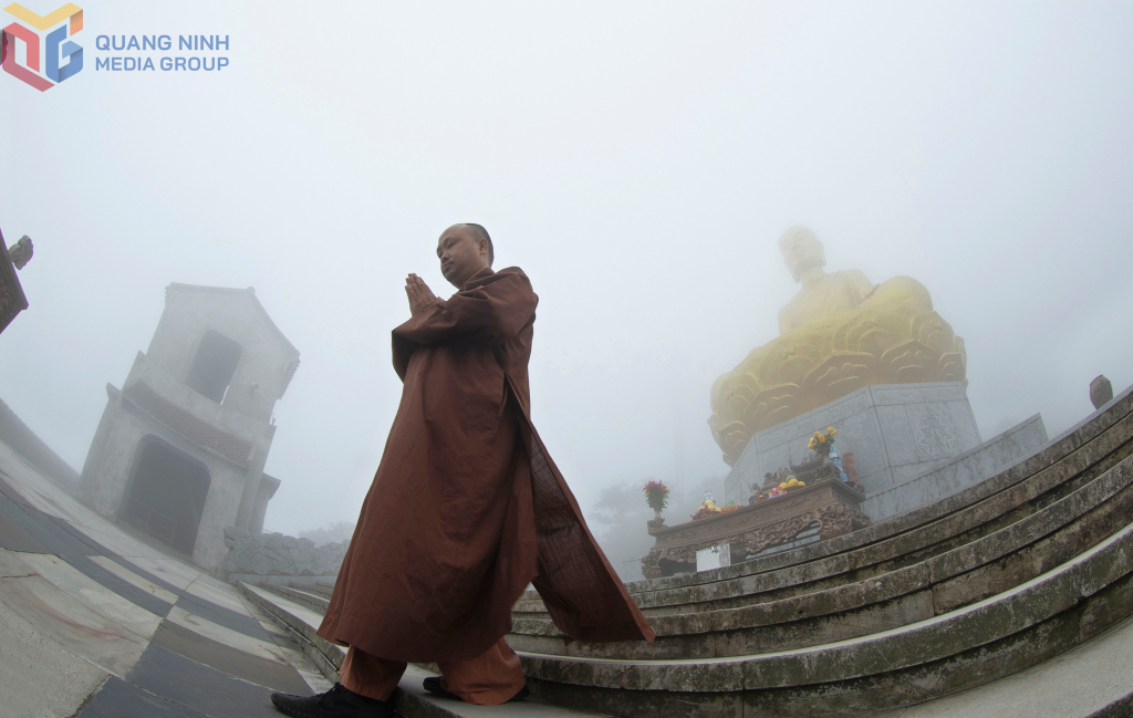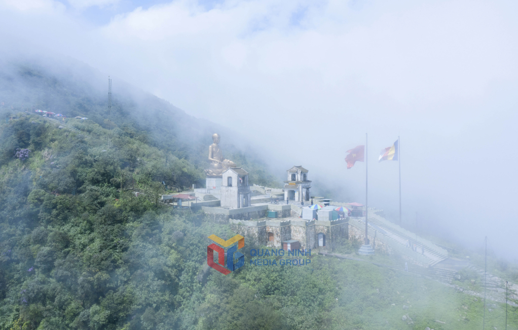 Tượng Phật hoàng uy linh tọa thiền giữa non thiêng Yên Tử, giữa mênh mông mây trắng.