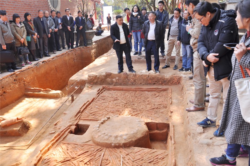 PGS.TS Tống Trung Tín và các nhà khoa học tham quan dấu tích khảo cổ thời Trần phát hiện được tại đền An Sinh, Khu di tích nhà Trần tại Đông Triều.